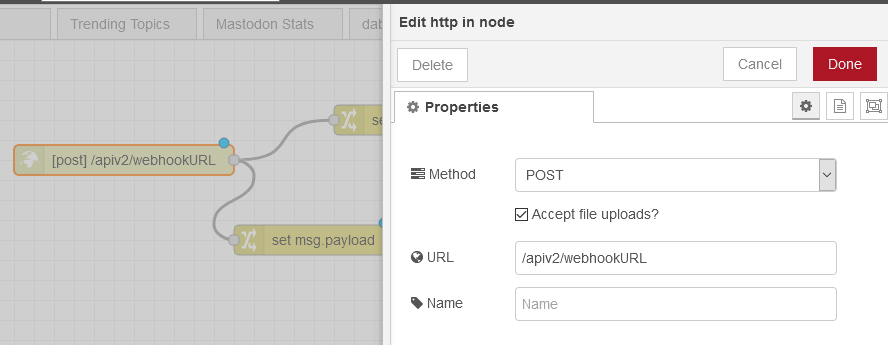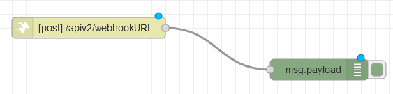 Then we need to define the URL endpoint for our webhook. In the example below we are using /apiv2/webhookURL. This will translate into a full webhook URL like the one below (assuming Node-RED is not exposed to the internet and only accepting connections on the local network):