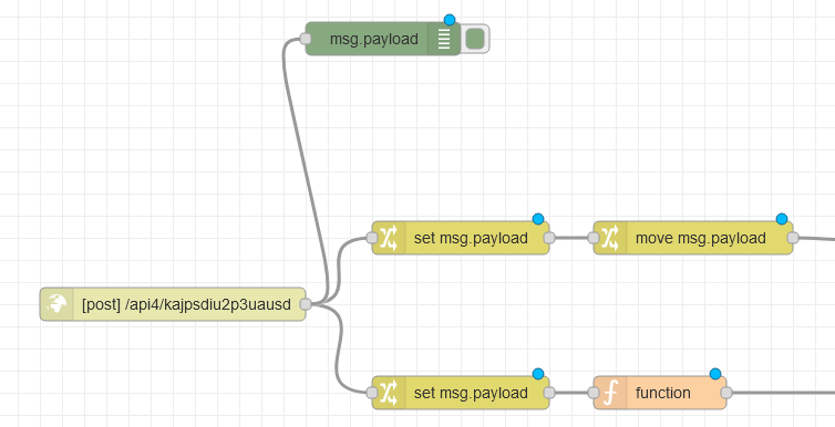 Let’s add two change nodes to our flow after the HTTP in node and connect them to the node we started with;
