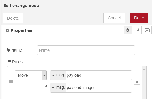 Just like we did before, we need to start shifting our msg.payload information around and our Mastodon API node will need the image to be in a specific part of the JSON message (msg.payload.image) and the text of the toot to be in a different node of the JSON (msg.payload.text). To do this will just use another change node and move msg.payload to msg.payload.image;