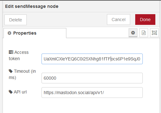 Configuring sendMessage just needs the API endpoint of your Mastodon server and the Access Token you generated when creating a new app tied to your Mastodon login.