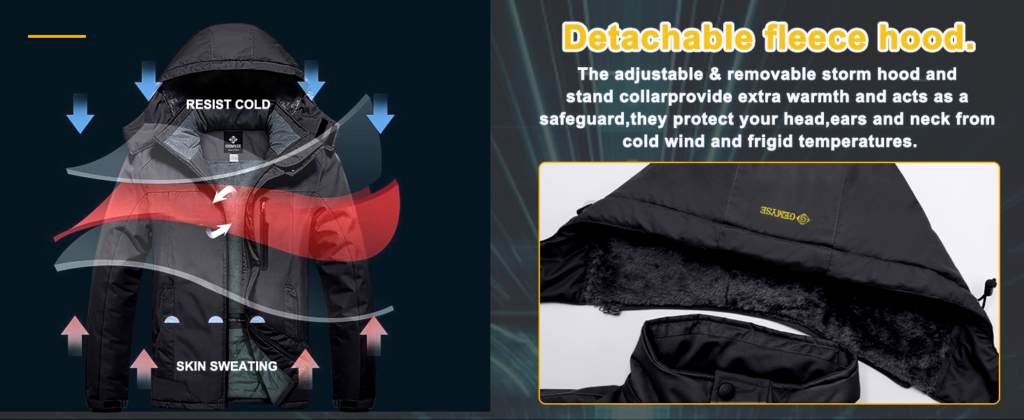 The jacket also has a professional water repellent coating and waterproof zippers that prevent water from penetrating. You don’t have to worry about getting wet or cold in rainy or snowy days. The jacket can keep your body dry and warm all day long.